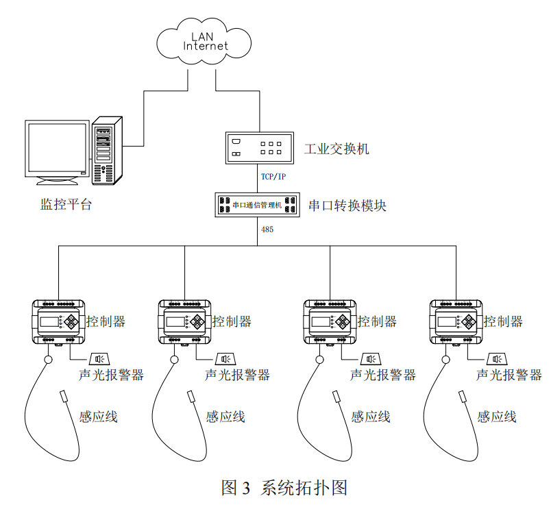 控制器與感應線連接,感應線安裝于漏液檢測區(qū)域,當發(fā)生液體泄漏時,觸發(fā)控制器報警及繼電器動作,通過 RS485 信號上傳泄漏數(shù)據(jù)至監(jiān)控平臺,精準定位,實現(xiàn)實時集中監(jiān)控??刂破骼^電器輸出信號可聯(lián)動控制外圍設備如聲光報警器、自動閥門與智能報警等設備。