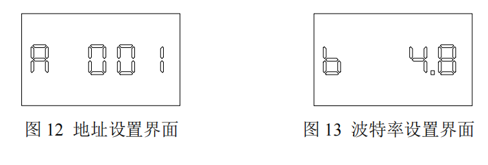 參數(shù)設置:長按 MENU 鍵參數(shù)設置界面,按一次 MENU 鍵切換參數(shù)(通訊地址、波特率),輕