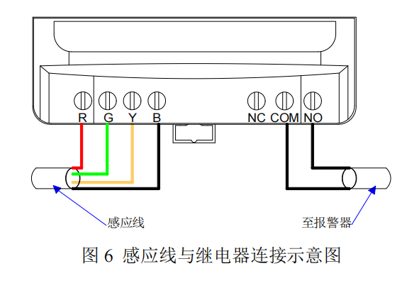 YEC-MM-A 控制器的繼電器觸點可用于本地或遠程報警,或聯(lián)動控制閥門等其它裝置,也可與控制自動化系統(tǒng)觸點輸入連接。繼電器僅針對泄漏報警工作,具有常開、常閉兩種狀態(tài),用戶可自由選擇接出方式。在整個泄漏檢測系統(tǒng)中,引出線用于連接控制器和泄漏感應線。連接如下圖所示: