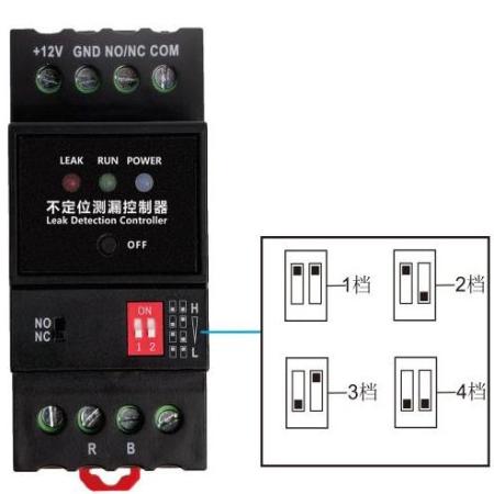 - 控制器設置有一個靈敏度調節(jié)撥碼開關,可適應不同環(huán)境下的漏液檢測,1至4檔檢測靈敏度依次增強,出廠默認為第4檔。各檔位所對應的控制器感應靈敏度如下表: