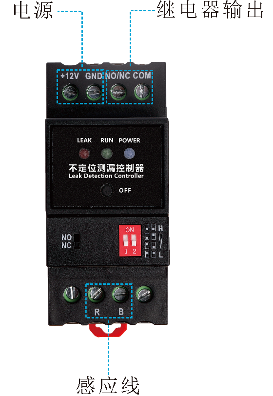 - 取少量的自來水(非凈化處理水),將感應線浸沒于水中,一秒鐘后,繼電器動作,LEAK指示燈亮紅色,蜂鳴器響,按下OFF按鈕可消音。擦干線纜上的水后,繼電器復位,LEAK指示燈滅;